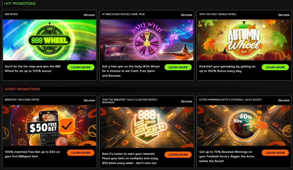 Yes, 888 Casino runs regular promotions such as weekly free spins, cashback offers, reload bonuses, prize drops and daily rewards like the Wish Wheel (availability may change seasonally).
