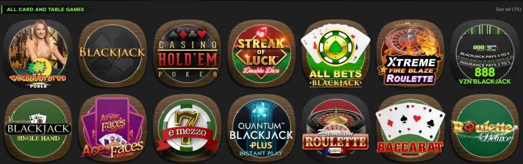 These electronic table games use certified random number generators and offer clear graphics and smooth gameplay. 888’s table game catalog might not be unlimited, but it covers all the classics with solid quality.