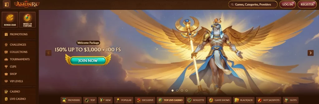 AmunRa Casino is an online gaming platform built around a striking ancient Egyptian theme. The site blends modern casino functionality with a distinctive visual style, offering a wide selection of games, an extensive list of bonuses, and flexible payment methods including crypto.