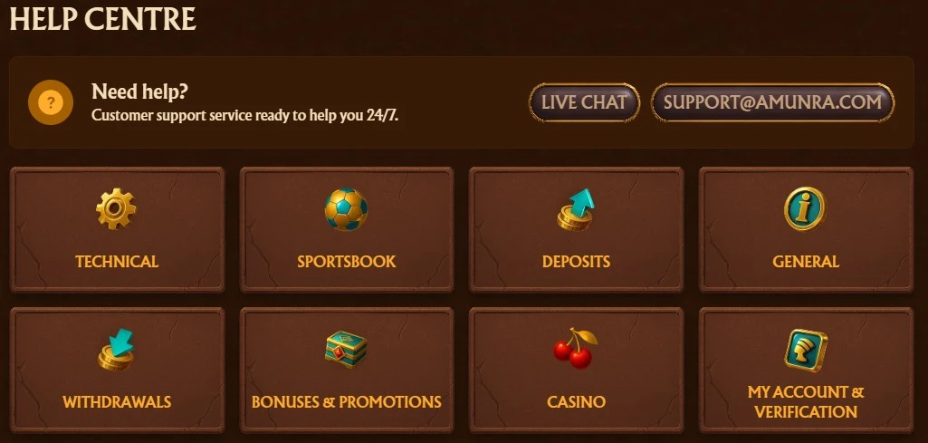 AmunRa Casino provides 24/7 customer support through live chat and email. Response times in live chat are typically fast, and support agents are trained to handle account questions, bonus inquiries, and verification assistance.
